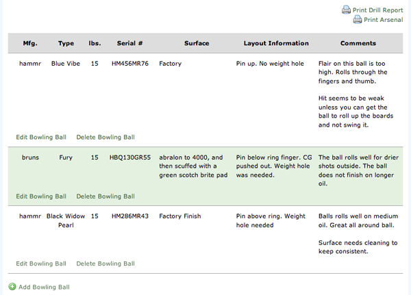View, Edit, Add, or Delete bowling balls that you are currently using and information about each one. This list of bowling balls and the detail that you gather will help you and your Pro Shop make wiser decisions on bowling balls you will purchase in the future. If you would like to print a copy of your Arsenal, there is a link in this section that will give you a printer friendly version.