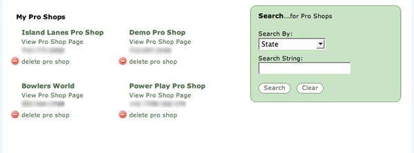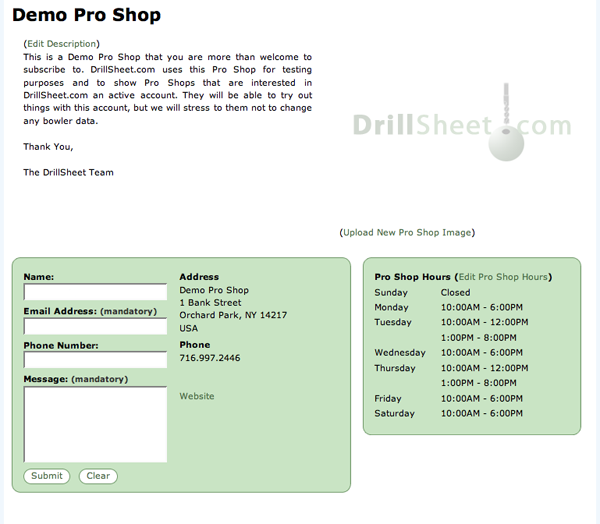 This is the page that bowlers will see when searching for Pro Shops to join. It will show a description, Pro Shop hours, contact information, and an email form. You will be able to edit the description, Pro Shop hours, and the Pro Shop's image directly from this page.