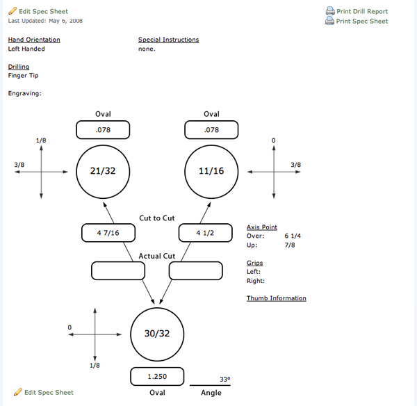 With a similar look to the drilling spec sheets your pro shop currently uses, you will be able to view and edit your own spec sheet. If you would like to print a copy of your spec sheet, there is a link in this section that will give you a printer friendly version.
