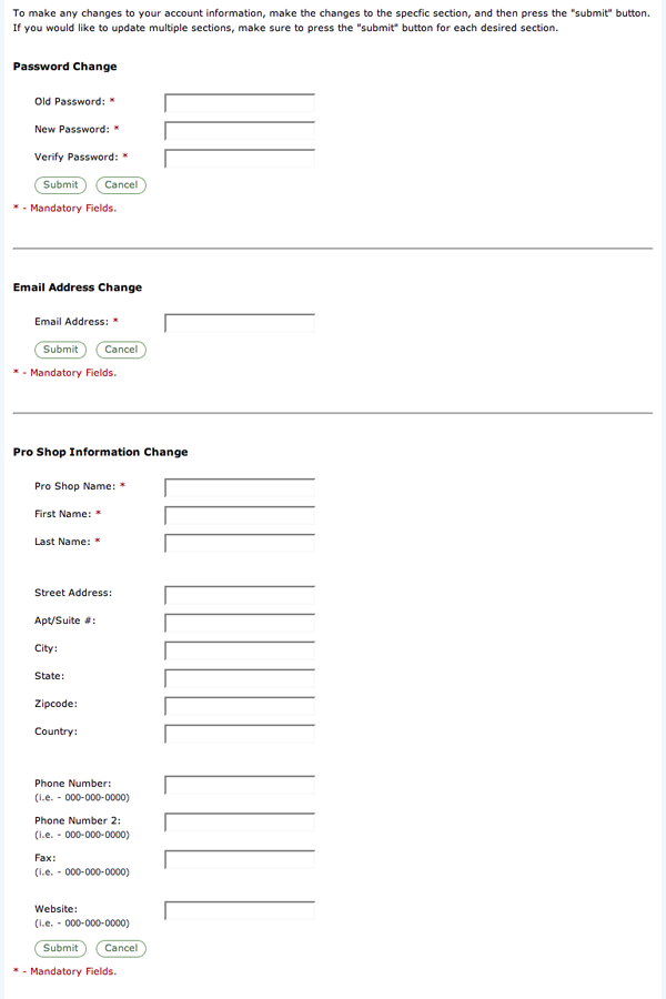 Keep your Account information up-to-date on this page. You will be able to modify your password, email address, or any contact information for your Pro Shop.