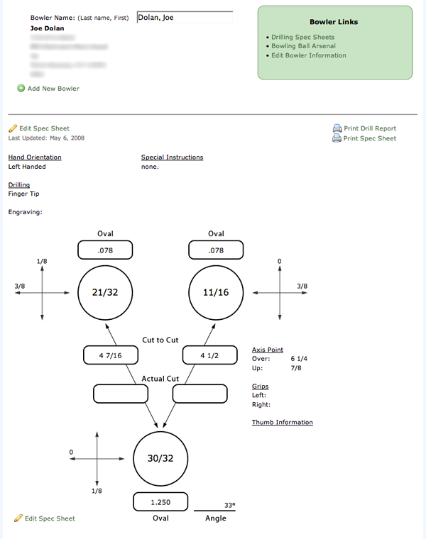 Be able to search for bowlers that are already linked to your Pro Shop or add new clients. When you load a client to the page, you will be able to edit/retrieve their contact information, drilling spec sheet, and information about the bowling balls they are currently using. There are links also available that will allow you to print the drilling spec sheets and the bowling ball arsenal in a printer friendly format.
